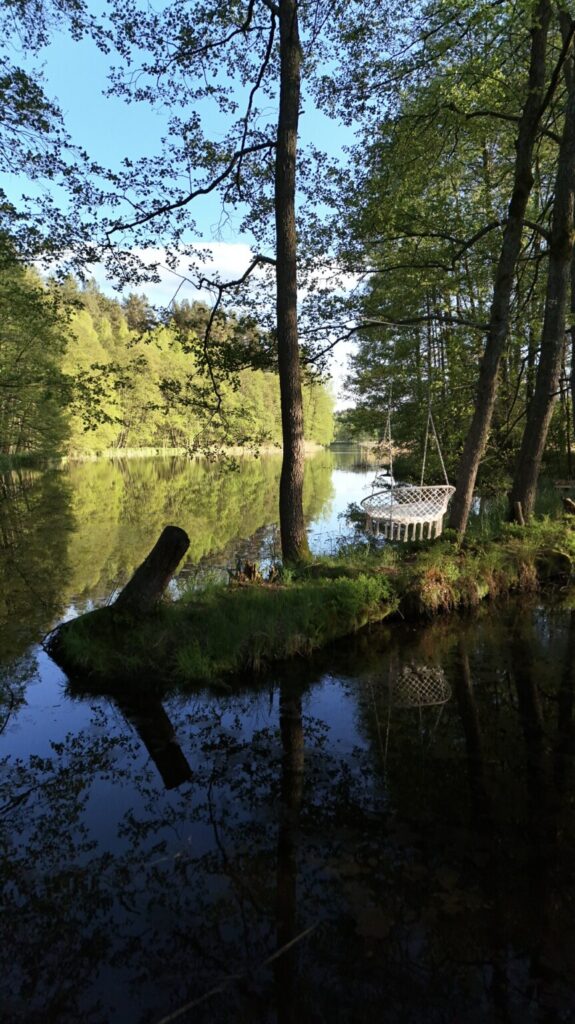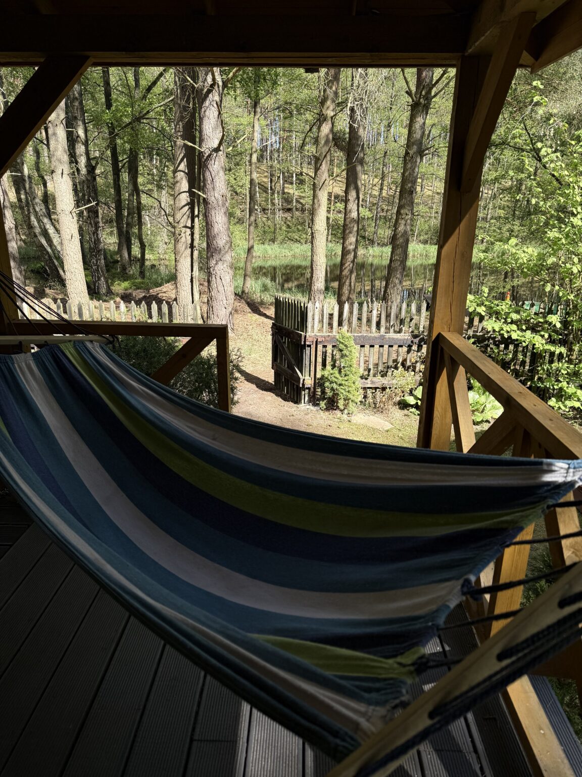 Hamaki rozwieszone przy domku, z widokiem na jezioro i las, to jedno z tych miejsc, które zapraszają do prawdziwego odpoczynku – bez planu, bez pośpiechu, bez słów.