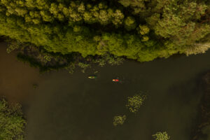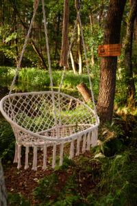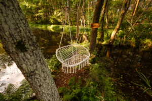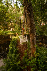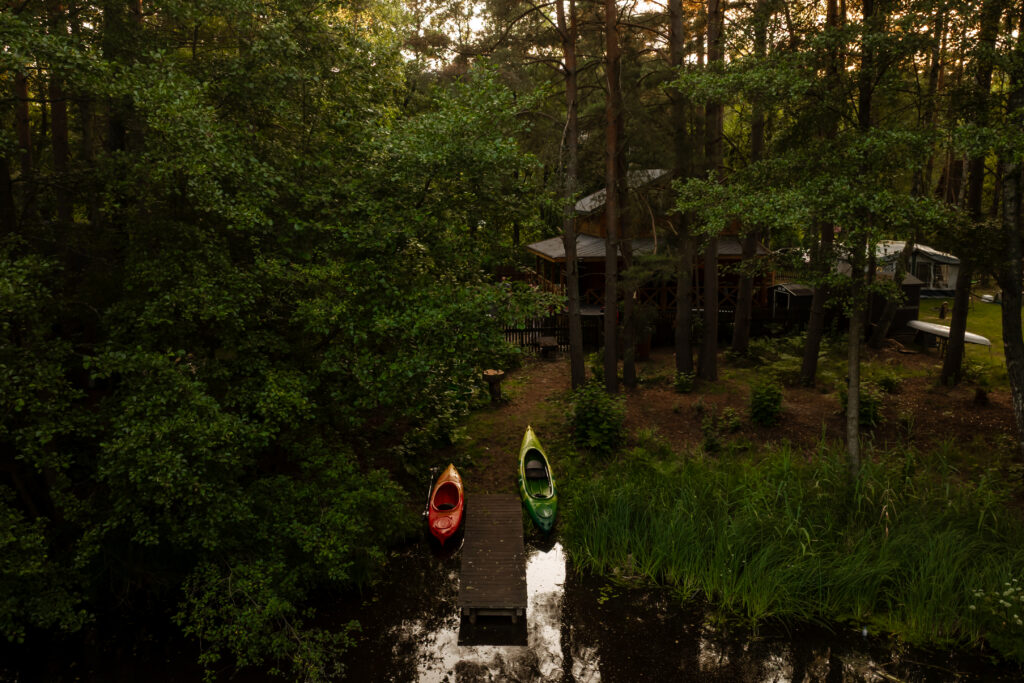 prywatny pomost, kajaki (do 8 osób + 2 dzieci) z kamizelkami, duży grill gazowy i kociołek żeliwny, tarasy z miejscem do jedzenia i odpoczynku, huśtawka nad wodą, hamaki wśród drzew, miejsce parkingowe.