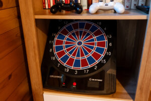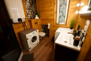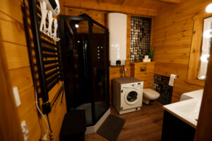 wygodne łóżka z pościelą i ręcznikami hotelowej jakości, stół jadalniany z krzesłami, 3 telewizory, konsola do gier, internet Wi-Fi, łazienka z prysznicem i suszarką do włosów, pralka i suszarka bębnowa, planszówki, książki, głośniki bezprzewodowe JBL, czujniki dymu i czadu oraz gaśnice.