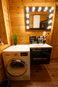 Wygodne łóżka z pościelą i ręcznikami hotelowej jakości, stół jadalniany z krzesłami, 3 telewizory, konsola do gier, internet Wi-Fi, łazienka z prysznicem i suszarką do włosów, pralka i suszarka bębnowa, planszówki, książki, głośniki bezprzewodowe JBL, czujniki dymu i czadu oraz gaśnice.