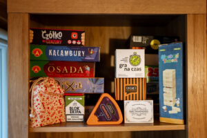 łóżeczko turystyczne, krzesełko do karmienia, dziecięce książeczki, gry planszowe, zabawki, puzzle, ogrodzony teren, piłka do siatkówki, lornetka.